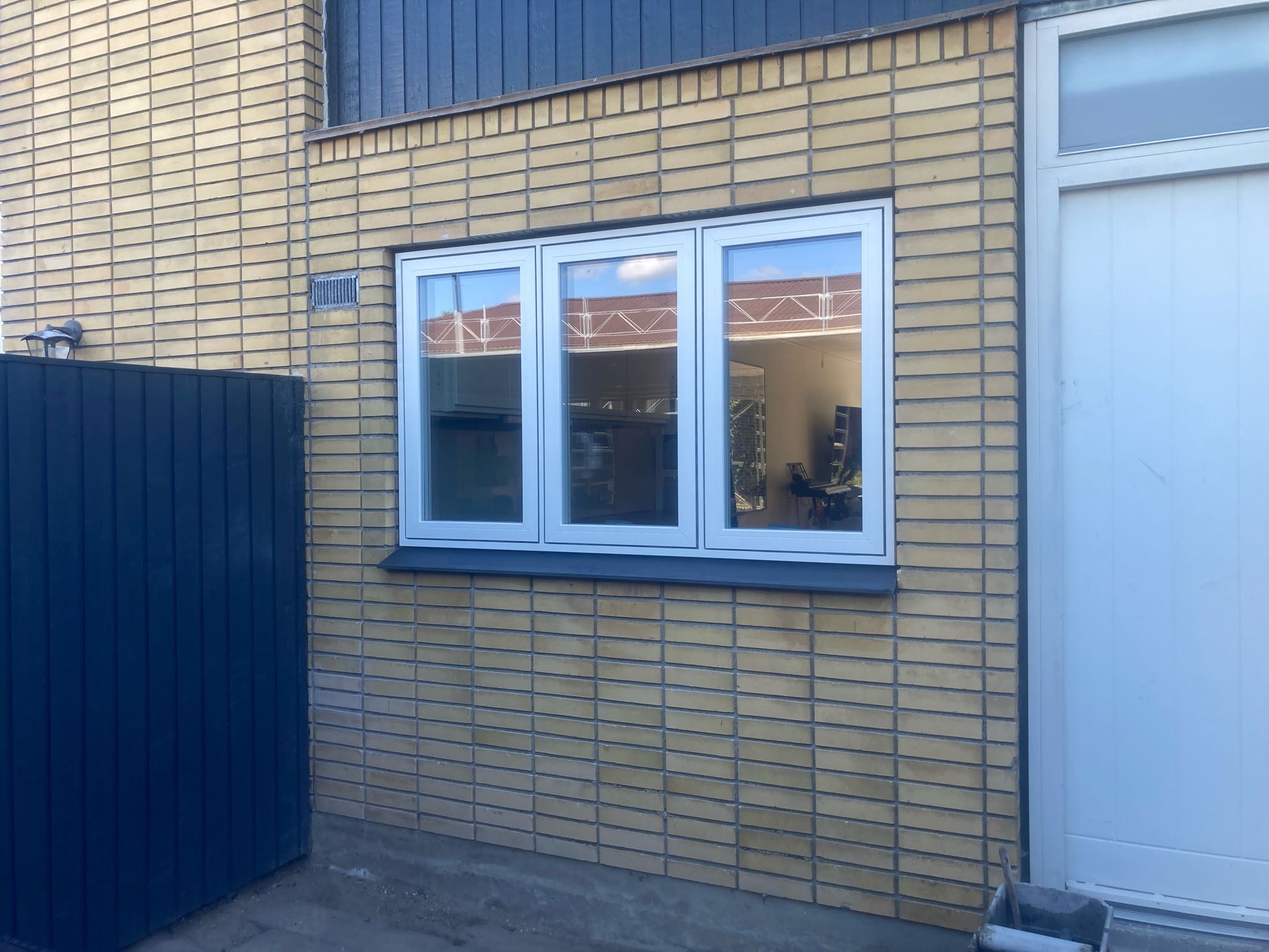 Vi laver altid en støvvæg indvendig, når vi laver murhuller, således holder vi styr på at støv og skidt ikke breder sig til hele huset. Udvendig afsluttede vi med et rulleskifte i bunden af partierne, ligesom der er ved husets øvrige vinduer.