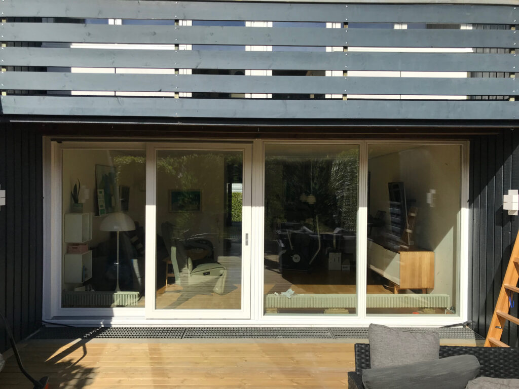 Iblandt de høje vinduespartier indgår en dobbelt skydedør. Den har to store døre som kan skydes til hver sin side. Det kan være svært at se på billederne hvad der er faste partier, som ikke kan åbne og lukke, og hvad der er selve skydedørene. Det er modellen Velfac-200 der gør at alle vinduesrammerne ser ens ud, uanset om de kan åbne eller ej. Det giver et super flot og ensartet udtryk.